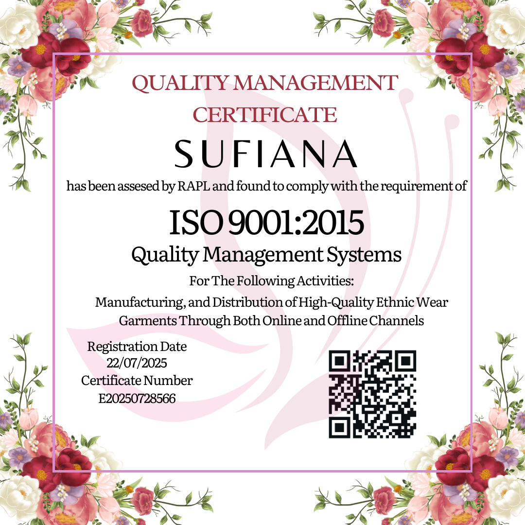 ISO 9001:2015 certification is not just a milestone but a continuous journey. At Sufiana, we are dedicated to evolving, improving, and setting new benchmarks in the ethnic fashion industry while staying true to our roots and values.